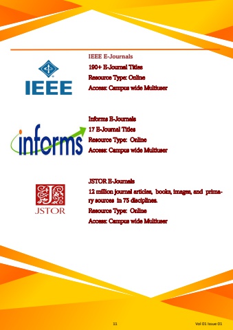 11 Vol 01 Issue 01 IEEE E-Journals 190+ E-Journal Titles Resource Type: Online Access: Campus wide Multiuser Informs E-Journals 17 E-Journal Titles Resource Type: Online Access: Campus wide Multiuser JSTOR E-Journals 12 million journal articles, books, images, and primary sources in 75 disciplines. Resource Type: Online Access: Campus wide Multiuser