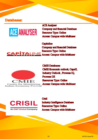 13 Vol 01 Issue 01 Databases: ACE Analyser Company and financial Database Resource Type: Online Access: Campus wide Multiuser Capitaline Company and financial Database Resource Type: Online Access: Campus wide Multiuser CMIE Databases CMIE Economic outlook, CapeX, Industry Outlook , Prowess IQ, Prowess DX Resources Type: Online Access: Campus wide Multiuser Crisil Industry Intelligence Database Resources Type: Online Access: Campus wide Multiuser