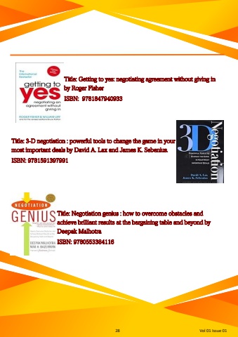 28 Vol 01 Issue 01 Title: Getting to yes: negotiating agreement without giving in by Roger Fisher ISBN: 9781847940933 Title: 3-D negotiation : powerful tools to change the game in your most important deals by David A. Lax and James K. Sebenius. ISBN: 9781591397991 Title: Negotiation genius : how to overcome obstacles and achieve brilliant results at the bargaining table and beyond by Deepak Malhotra ISBN: 9780553384116