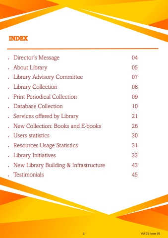 3 Vol 01 Issue 01 INDEX%uf0a8 Director%u2019s Message 04%uf0a8 About Library 05%uf0a8 Library Advisory Committee 07%uf0a8 Library Collection 08%uf0a8 Print Periodical Collection 09%uf0a8 Database Collection 10%uf0a8 Services offered by Library 21%uf0a8 New Collection: Books and E-books 26%uf0a8 Users statistics 30%uf0a8 Resources Usage Statistics 31%uf0a8 Library Initiatives 33%uf0a8 New Library Building & Infrastructure 43%uf0a8 Testimonials 45