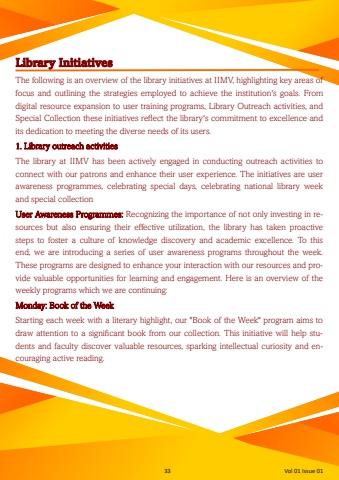 33 Vol 01 Issue 01 Library Initiatives The following is an overview of the library initiatives at IIMV, highlighting key areas of focus and outlining the strategies employed to achieve the institution's goals. From digital resource expansion to user training programs, Library Outreach activities, and Special Collection these initiatives reflect the library's commitment to excellence and its dedication to meeting the diverse needs of its users.1. Library outreach activities The library at IIMV has been actively engaged in conducting outreach activities to connect with our patrons and enhance their user experience. The initiatives are user awareness programmes, celebrating special days, celebrating national library week and special collectionUser Awareness Programmes: Recognizing the importance of not only investing in resources but also ensuring their effective utilization, the library has taken proactive steps to foster a culture of knowledge discovery and academic excellence. To this end, we are introducing a series of user awareness programs throughout the week. These programs are designed to enhance your interaction with our resources and provide valuable opportunities for learning and engagement. Here is an overview of the weekly programs which we are continuing:Monday: Book of the WeekStarting each week with a literary highlight, our \draw attention to a significant book from our collection. This initiative will help students and faculty discover valuable resources, sparking intellectual curiosity and encouraging active reading.