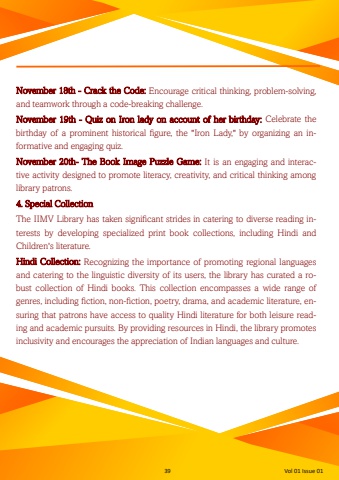 39 Vol 01 Issue 01 November 18th - Crack the Code: Encourage critical thinking, problem-solving, and teamwork through a code-breaking challenge.November 19th - Quiz on Iron lady on account of her birthday: Celebrate the birthday of a prominent historical figure, the \formative and engaging quiz.November 20th- The Book Image Puzzle Game: It is an engaging and interactive activity designed to promote literacy, creativity, and critical thinking among library patrons.4. Special Collection The IIMV Library has taken significant strides in catering to diverse reading interests by developing specialized print book collections, including Hindi and Children's literature.Hindi Collection: Recognizing the importance of promoting regional languages and catering to the linguistic diversity of its users, the library has curated a robust collection of Hindi books. This collection encompasses a wide range of genres, including fiction, non-fiction, poetry, drama, and academic literature, ensuring that patrons have access to quality Hindi literature for both leisure reading and academic pursuits. By providing resources in Hindi, the library promotes inclusivity and encourages the appreciation of Indian languages and culture.