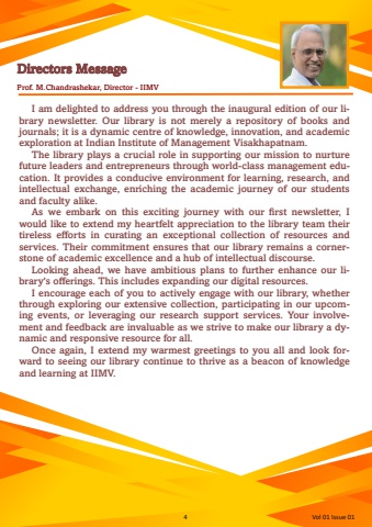 4 Vol 01 Issue 01 Directors Message Prof. M.Chandrashekar, Director - IIMV I am delighted to address you through the inaugural edition of our library newsletter. Our library is not merely a repository of books and journals; it is a dynamic centre of knowledge, innovation, and academic exploration at Indian Institute of Management Visakhapatnam.The library plays a crucial role in supporting our mission to nurture future leaders and entrepreneurs through world-class management education. It provides a conducive environment for learning, research, and intellectual exchange, enriching the academic journey of our students and faculty alike.As we embark on this exciting journey with our first newsletter, I would like to extend my heartfelt appreciation to the library team their tireless efforts in curating an exceptional collection of resources and services. Their commitment ensures that our library remains a cornerstone of academic excellence and a hub of intellectual discourse.Looking ahead, we have ambitious plans to further enhance our library's offerings. This includes expanding our digital resources.I encourage each of you to actively engage with our library, whether through exploring our extensive collection, participating in our upcoming events, or leveraging our research support services. Your involvement and feedback are invaluable as we strive to make our library a dynamic and responsive resource for all.Once again, I extend my warmest greetings to you all and look forward to seeing our library continue to thrive as a beacon of knowledge and learning at IIMV.