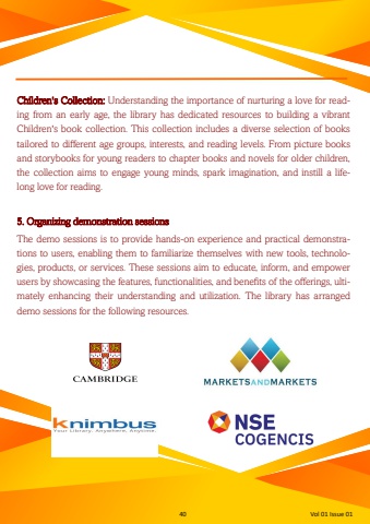 40 Vol 01 Issue 01 Children's Collection: Understanding the importance of nurturing a love for reading from an early age, the library has dedicated resources to building a vibrant Children's book collection. This collection includes a diverse selection of books tailored to different age groups, interests, and reading levels. From picture books and storybooks for young readers to chapter books and novels for older children, the collection aims to engage young minds, spark imagination, and instill a lifelong love for reading. 5. Organizing demonstration sessions The demo sessions is to provide hands-on experience and practical demonstrations to users, enabling them to familiarize themselves with new tools, technologies, products, or services. These sessions aim to educate, inform, and empower users by showcasing the features, functionalities, and benefits of the offerings, ultimately enhancing their understanding and utilization. The library has arranged demo sessions for the following resources.