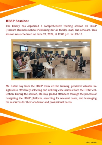 41 Vol 01 Issue 01 HBSP Session:The library has organized a comprehensive training session on HBSP (Harvard Business School Publishing) for all faculty, staff, and scholars. This session was scheduled on June 27, 2024, at 12:00 p.m. in LLT-10.Mr. Rahul Roy from the HBSP team led the training, provided valuable insights into effectively selecting and utilizing case studies from the HBSP collection. During the session, Mr. Roy guided attendees through the process of navigating the HBSP platform, searching for relevant cases, and leveraging the resources for their academic and professional needs.