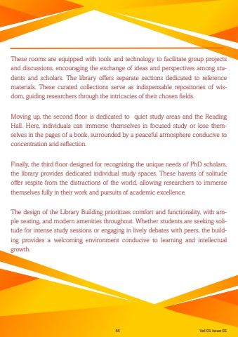 44 Vol 01 Issue 01 These rooms are equipped with tools and technology to facilitate group projects and discussions, encouraging the exchange of ideas and perspectives among students and scholars. The library offers separate sections dedicated to reference materials. These curated collections serve as indispensable repositories of wisdom, guiding researchers through the intricacies of their chosen fields. Moving up, the second floor is dedicated to quiet study areas and the Reading Hall. Here, individuals can immerse themselves in focused study or lose themselves in the pages of a book, surrounded by a peaceful atmosphere conducive to concentration and reflection. Finally, the third floor designed for recognizing the unique needs of PhD scholars, the library provides dedicated individual study spaces. These havens of solitude offer respite from the distractions of the world, allowing researchers to immerse themselves fully in their work and pursuits of academic excellence. The design of the Library Building prioritizes comfort and functionality, with ample seating, and modern amenities throughout. Whether students are seeking solitude for intense study sessions or engaging in lively debates with peers, the building provides a welcoming environment conducive to learning and intellectual growth.