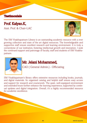45 Vol 01 Issue 01 Testimonials Prof. Kalyan.K, Asst. Prof. & Chair-LACThe IIM Visakhapatnam Library is an outstanding academic resource with a ever growing collection and state of the art digital resources. The knowledgeable and supportive staff ensure excellent research and learning environment. It is truly a cornerstone of our institution, fostering intellectual growth and innovation. I seek the continued support and patronage of faculty, staff and students of IIM Visakhapatnam. Mr. Jelani Mohammed, CAO ( General Admin.) - Officiating IIM Visakhapatnam's library offers extensive resources including books, journals, and digital materials. Its organized catalog and helpful staff ensure easy access and support for research and coursework. The quiet, well-equipped environment and extended hours further enhance the learning experience, supported by continual updates and digital integration. Overall, it's a highly recommended resource for academic excellence.