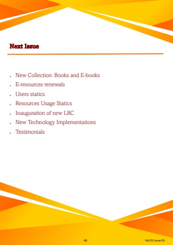 46 Vol 01 Issue 01 Next Issue %uf0a8 New Collection: Books and E-books%uf0a8 E-resources renewals%uf0a8 Users statics%uf0a8 Resources Usage Statics%uf0a8 Inauguration of new LRC%uf0a8 New Technology Implementations%uf0a8 Testimonials