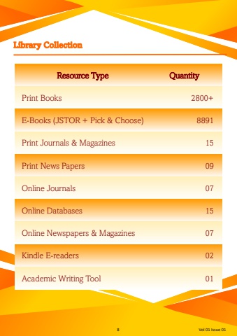 8 Vol 01 Issue 01 Library Collection Resource Type Quantity Print Books 2800+E-Books (JSTOR + Pick & Choose) 8891Print Journals & Magazines 15Print News Papers 09Online Journals 07Online Databases 15Online Newspapers & Magazines 07Kindle E-readers 02Academic Writing Tool 01