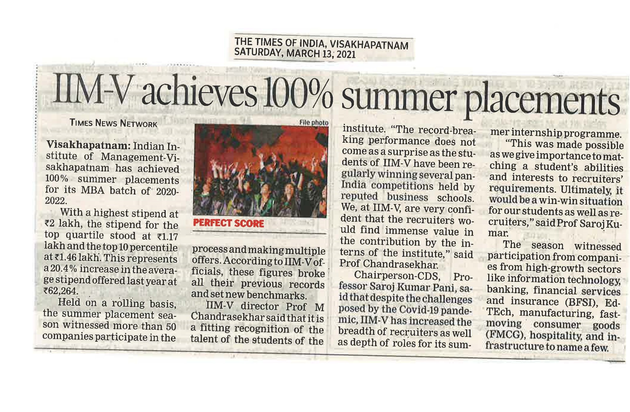 IIMV achieves 100 percent summer placements - 13.03.2021