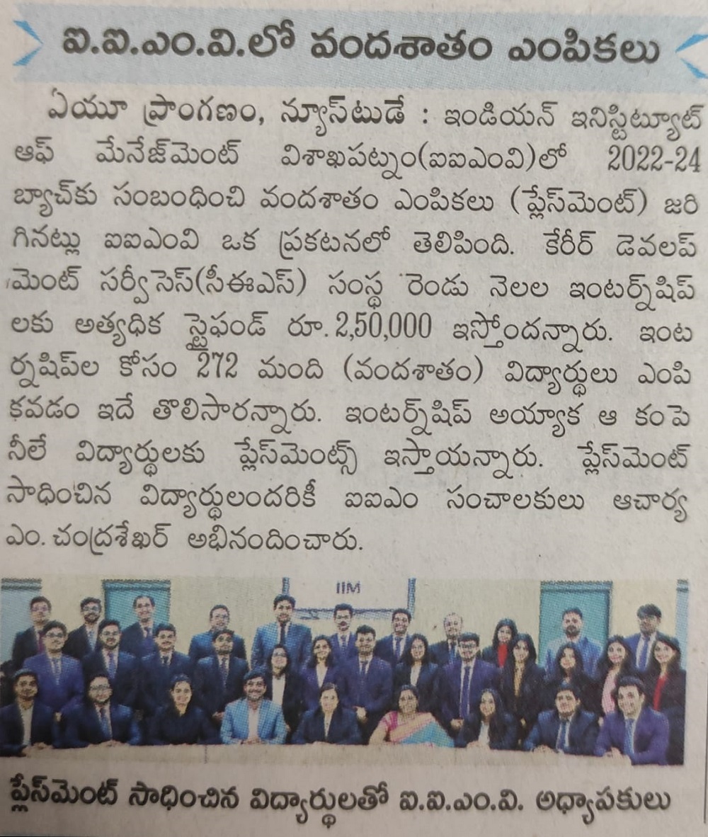100 percentage Placements in Summer Internship at IIM Vishakhapatnam - 24.03.2023